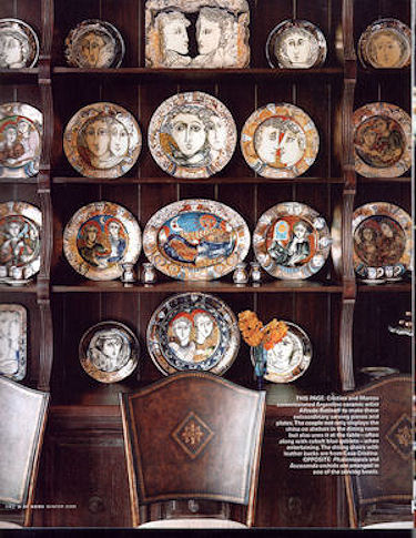 The entire set was then installed at Cristina�s dining room where a special wall cabinet piece was created especially for the set. This series was completed in a year and a half, each piece sketched, painted, and fired by Alfredo.