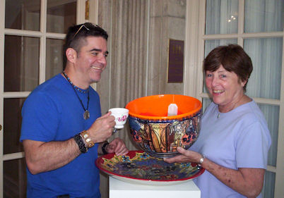 The piece was created in white clay and majolica underglazes, a technique reminiscent of old Italian ceramics and glazed in a myriad of different colors using images Alfredo created of women in splendid gowns and hats enjoying tea together. Alfredo called the piece �Tea at Strathmore�, and in the pictures we can see Alfredo and Millie Shott installing and presenting the piece publicly and toasting for many more teas at Strathmore.