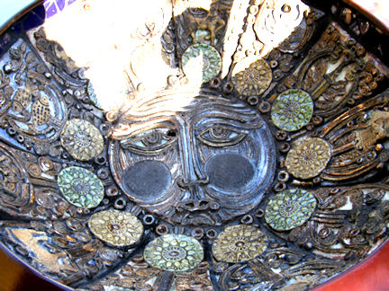 The large steel bowl that forms the base of the kaleidoscope became the object of Alfredo�s new creation. In the bottom of the bowl, Alfredo created a large sun which formed the center of the piece from which twelve segments emanate as rays from the sun, each one signifying the twelve signs of the zodiac.