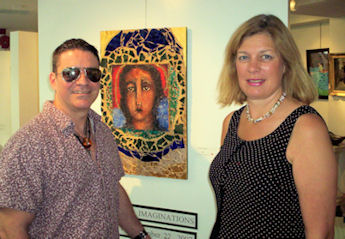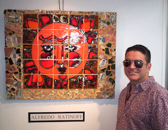 "Expressive Imaginations" was a summer show full of creativity and imagination, from watercolor, woodturning, poured acrylic on canvas, oils, gouache, and acrylic. Alfredo presented two wall pieces that sold the night of the opening to two of his collectors: �Angel�, created using the encaustic technique, an ancient method in which pigments dissolved in wax are painted on wood, and mosaiqued in Tiffany glass with 24kt gold. The second piece Alfredo presented was a mosaic entitled �Sun� where regular and small marble tiles composed a mosaic piece with inclusions of original pieces of china from Turkish plates.