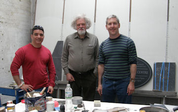 Alfredo, Ieuan Rees, and Shane in the stone-carving studio