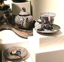 With an opening reception on May 2nd 2008, the artists visiting Wales presented a completely different perspective on clay from their own works: Ramon�s incredible and beautiful raku pieces; Malcolm Davis unique shapes covered in his famous shino glaze; Elizabeth Kendall's newest and marvelous clay installations; Jacqueline Kieran's organic and beautiful tile pieces; Gisele Nimic's refined and ethereal surface treatments; Elke Seefeldt's famous blackware; and Novie�s phenomenal sculptures combining iconography and ancient myths. For this exhibit Alfredo presented a new series �The Apothecary of the Elixirs� a new series of mosaic plates of which one was featured for the poster of the show.