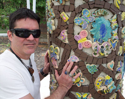 Alfredo worked with more than a hundred participants, children and adults, creating a wide variety of butterflies and flower shapes which became part of a mosaic that was the centerpiece of the garden. Once the shapes were molded, glazed, and fired, this gargantuan project came to a wonderful conclusion as each of the shapes were assembled in a giant mosaic on three cement columns poured on the site this summer (2008).