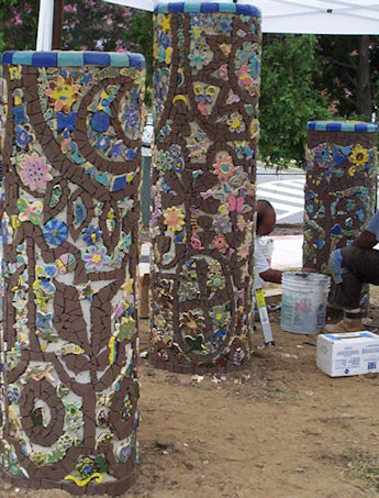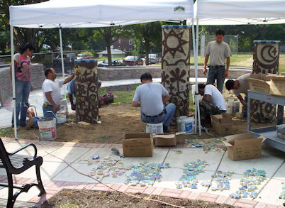 The finished mosaic piece is titled �The Columns of the Sun and Moon�, and is complete with landscaping that will be in full blossom by 2009. Alfredo once again wants to express his gratitude to Novie Trump who was an invaluable help in every single aspect of the project. Her boundless energy as well as the efforts of the Division of Cultural Affairs of Arlington County made this mega project possible.