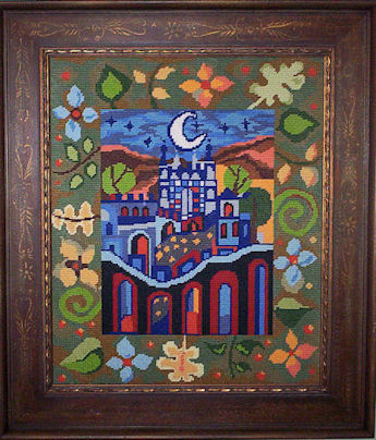Guided by Liz�s expertise in the field of needlepoint, Alfredo created many different sketches, and after hours of work and discussion, three final designs were transferred onto Fabriano paper and colored with a planned palette based on the selected colored wools. Each of the three designs was created from a different important epoch of art: one, a medieval-styled landscape titled �Moonlight�; second, a traditional renaissance image titled �The Angel of the Arts�; and third, a design based on a colorful, impressionist palette titled �The Garden Sun�. Each design was carefully studied and analyzed to obtain the most accurate image to be transferred onto the final canvases. Each canvas is printed individually and by hand in Devon, England by Phoenix Design, and they are bound in a cotton binding for a more delicate finish.